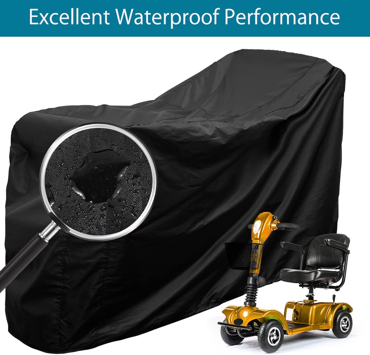 With dimensions of 140 × 66 × 91 cm, it accommodates most full-size 4-wheel mobility scooters and wheelchairs. The built-in elastic drawstring system tightens the cover at the base to prevent flapping in the wind and ensure a close, secure fit.